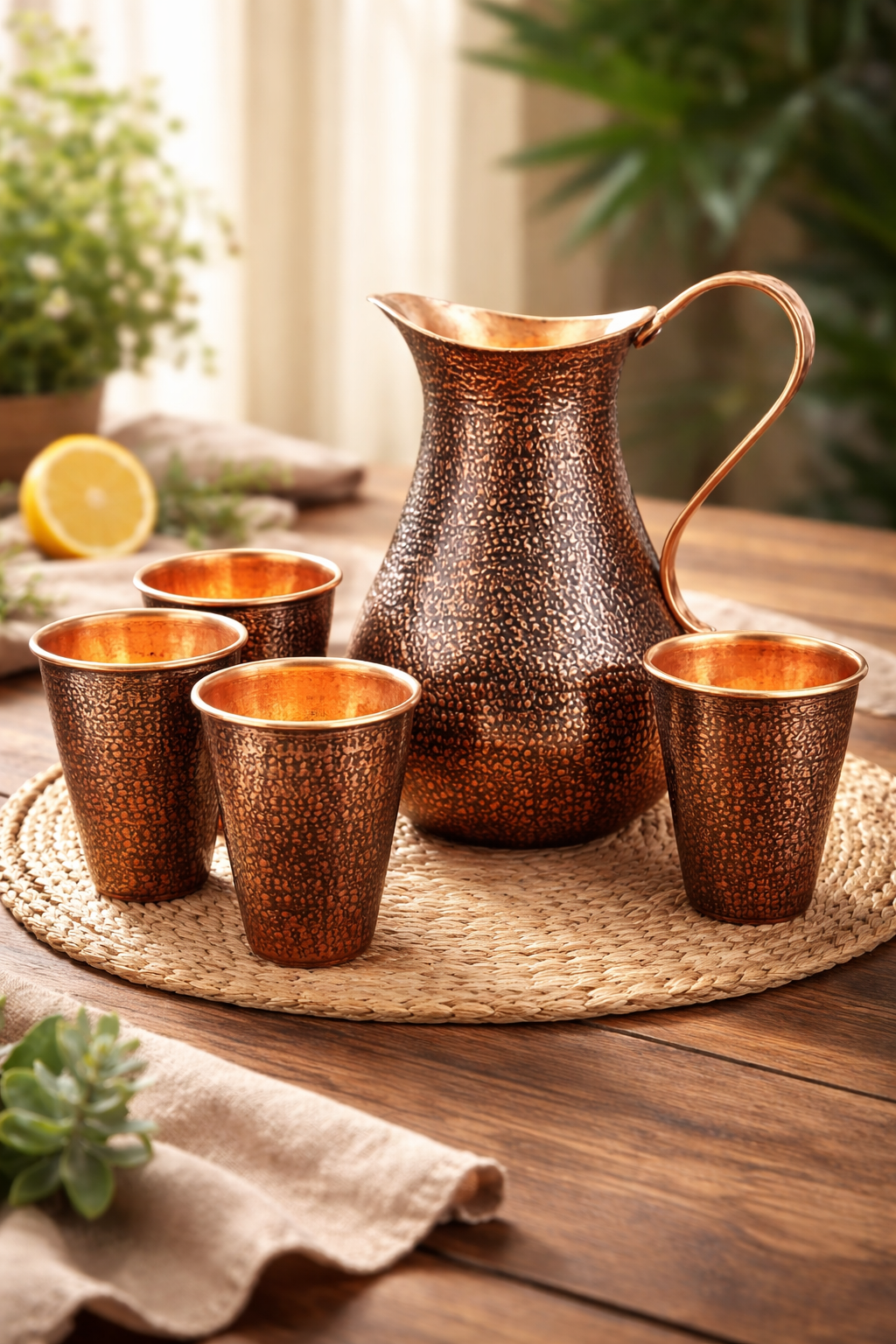 Es un juego con un toque elegante y clásico. Además sabías que almacenar agua en esta jarra de cobre traerá grandes beneficios a tu salud.